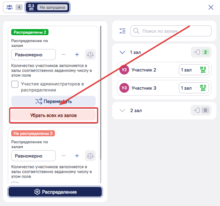 - кнопкой «Убрать всех из залов» — сервис очистит все залы и вернет строчки участников в состояние «Не распределен»;