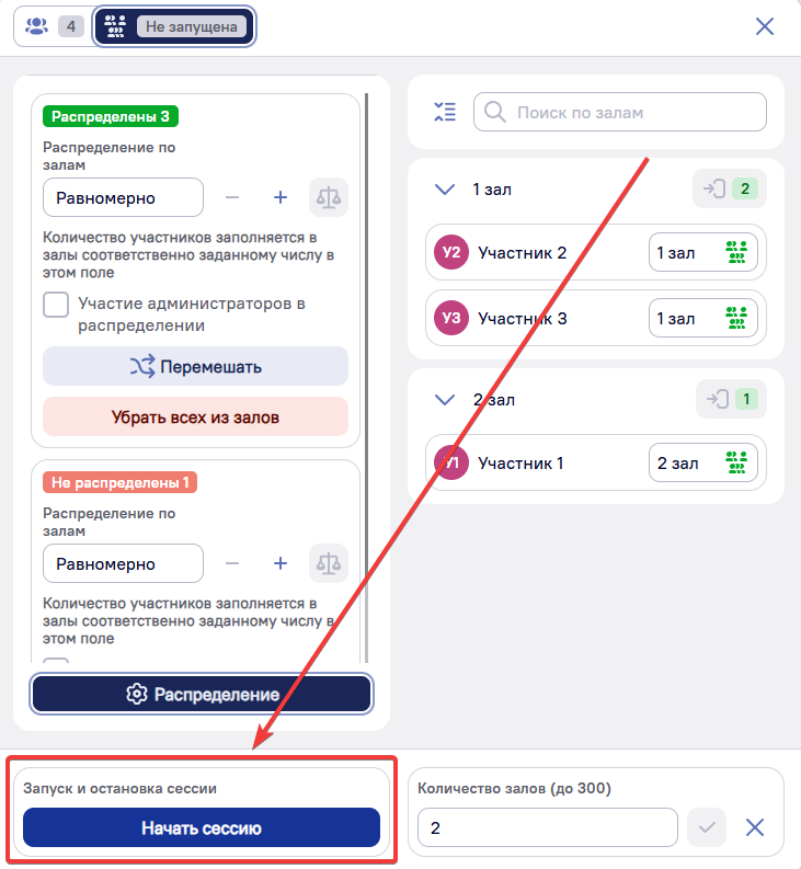 4. После распределения участников в меню настройки, нажмите «Начать сессию».