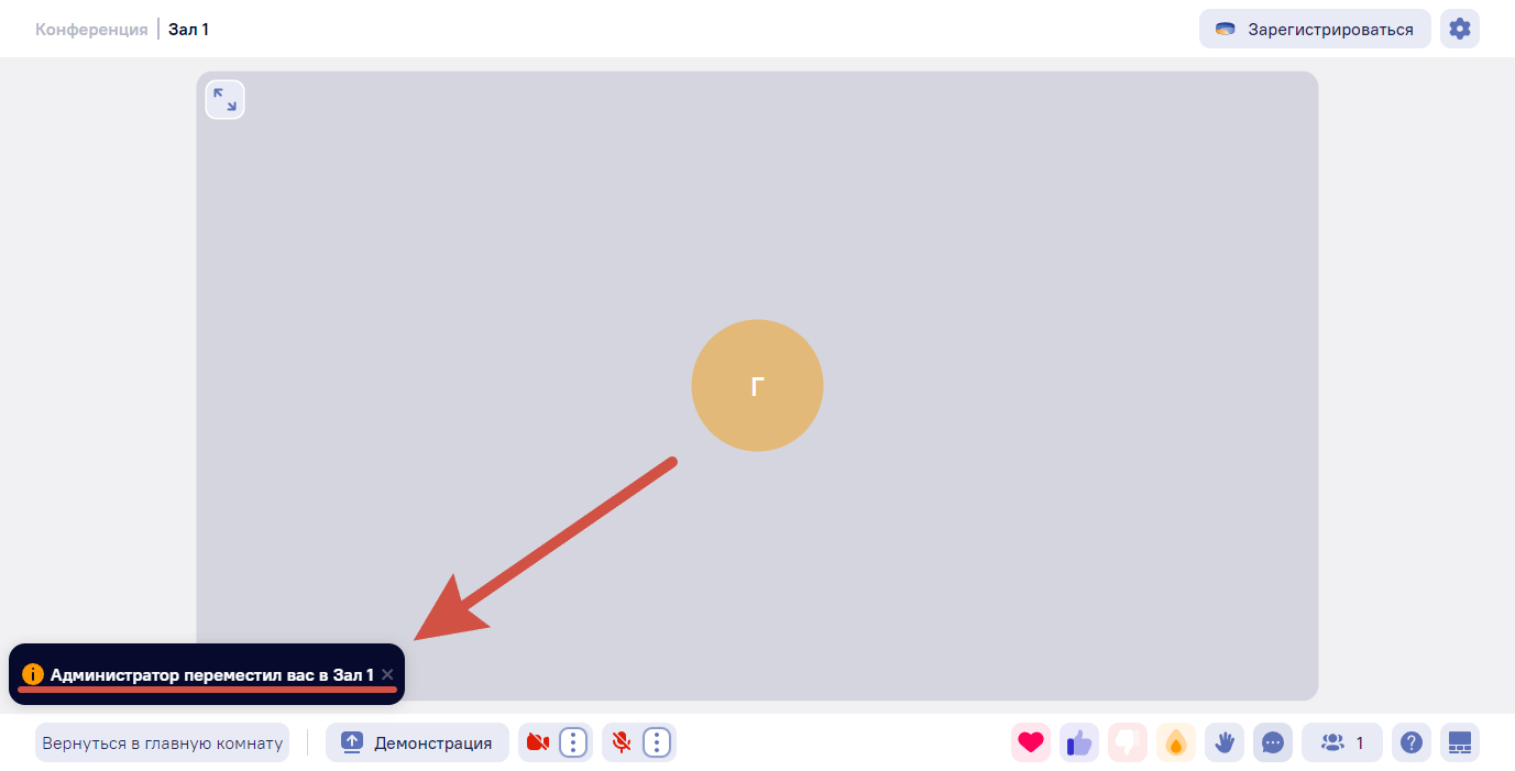 После перемещения, участники окажутся в соответствующем зале и увидят об этом уведомление.