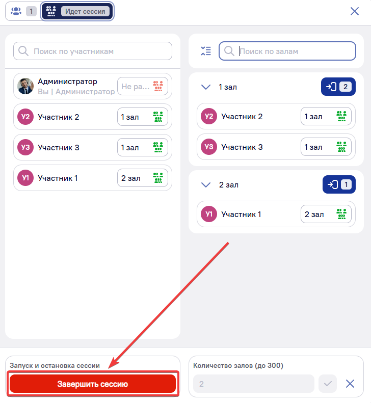 Чтобы расформировать группы и вернуть всех в главную комнату, нажмите «Завершить сессию». При этом настройки залов сохранятся и участников можно распределить по залам повторно.