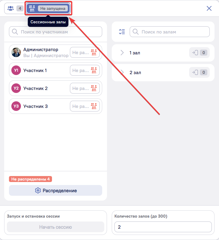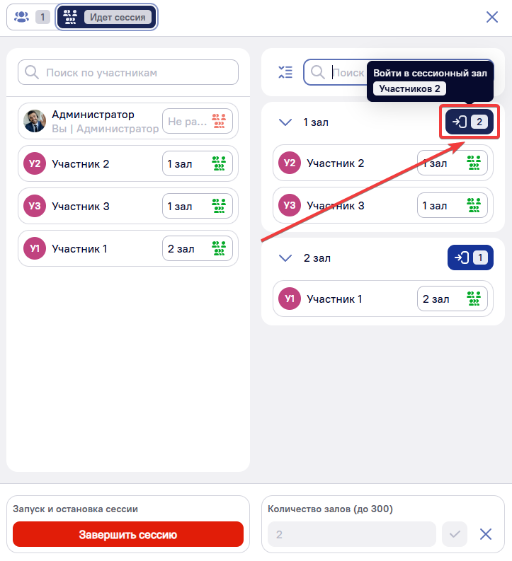 2. В открывшемся меню, напротив счетчика участников, нажмите на иконку «Сессионные залы»