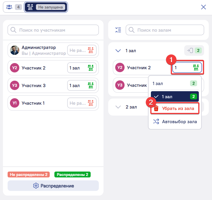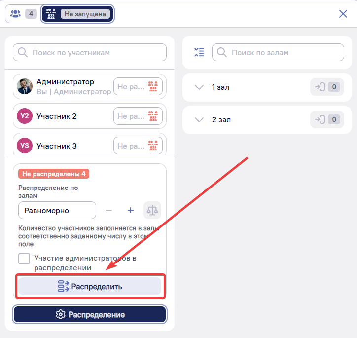 - кнопкой «Распределить» — платформа распределит всех участников равномерно по всем залам или же распределит конкретное количество участников в каждый зал, в зависимости от настроек, которые вы выберете;