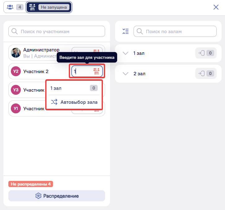 - Для перемещения участника в какой-либо зал вручную, необходимо нажать по полю для ввода справа от имени участника и вписать цифру нужного зала