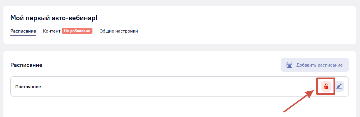 Чтобы удалить расписание, наведите на него курсор и нажмите на красную иконку мусорного бака.