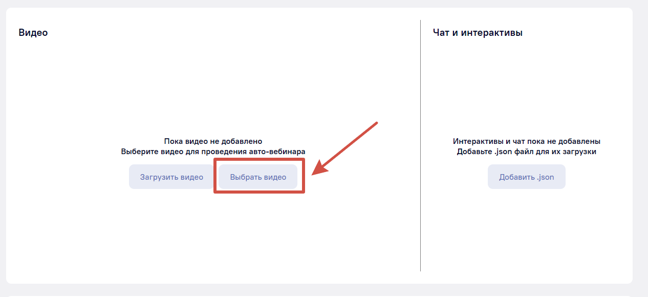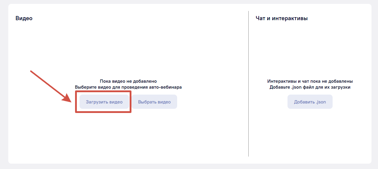 Чтобы добавить видео к вашему авто-вебинару, нажмите «Загрузить видео» или «Выбрать видео».