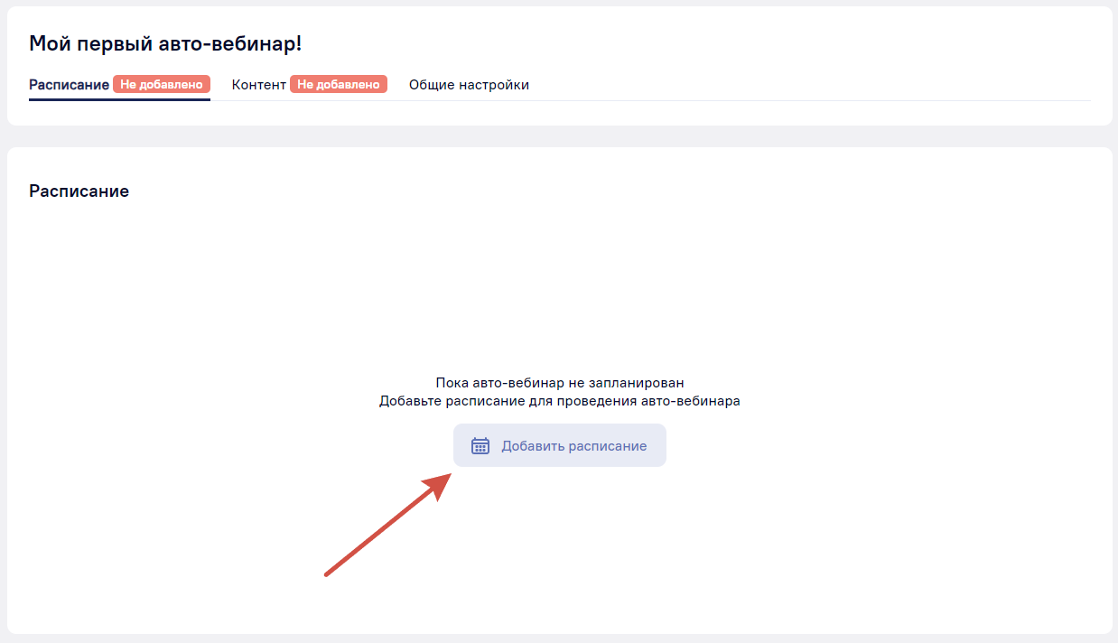 Чтобы начать использовать авто-вебинар, добавьте расписание и контент.