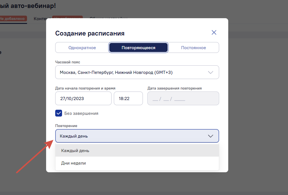 Повторяющийся авто-вебинар — это трансляция, которая будет повторяться каждый день в определенное время и интервал. Также можно настроить дни недели.