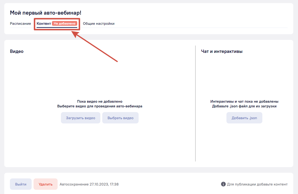 Осталось добавить контент — информационное содержание вашего вебинара. В него входит: видеозапись, чат и интерактив. Чтобы добавить контент, нажмите на вкладку «Контент».