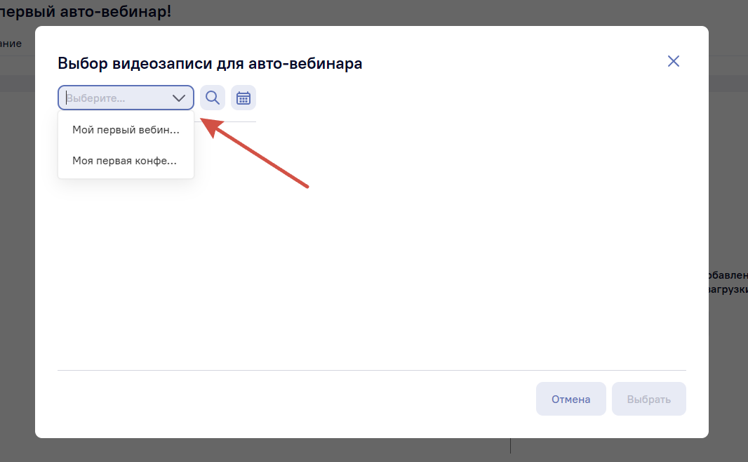 После нажатия откроется новое окно «Выбор записи для авто-вебинара». Нажмите на пустое поле в верхнем левом углу окна. Выпадет контекстное меню, где нужно выбрать комнату (вебинар или конференцию) из которой будет загружена видеозапись. Также можно воспользоваться поиском по видеозаписям в конкретной комнате, нажав на значок лупы. При нажатии на иконку в виде календаря, можно отсортировать записи по конкретным датам.