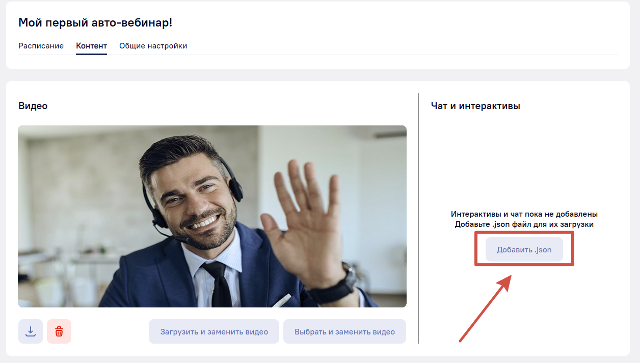 Последняя, но не обязательная часть добавляемого контента — «Чат и интерактивы». Добавить чат и интерактивы можно нажатием на кнопку «Добавить .json», после чего выберите файл с расширением .json.