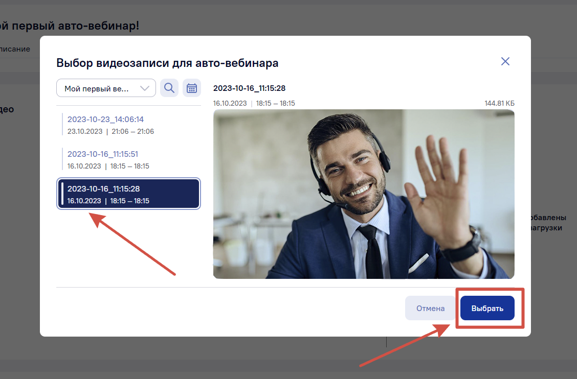 Выбрав нужную комнату, откроется список видеозаписей. Нажмите на видео, которое вас интересует и загрузите его в авто-вебинар при помощи кнопки «Выбрать» в правом нижнем углу.