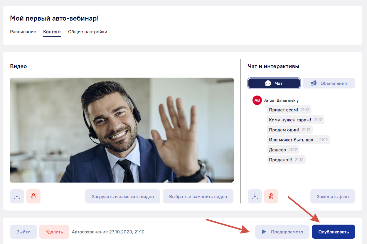 Предпросмотр осуществляется нажатием на кнопку «Предпросмотр», а запустить авто-вебинар нужно нажатием на «Опубликовать». Перед запуском не забудьте еще раз проверить настройки комнаты на вкладке «Общие настройки».