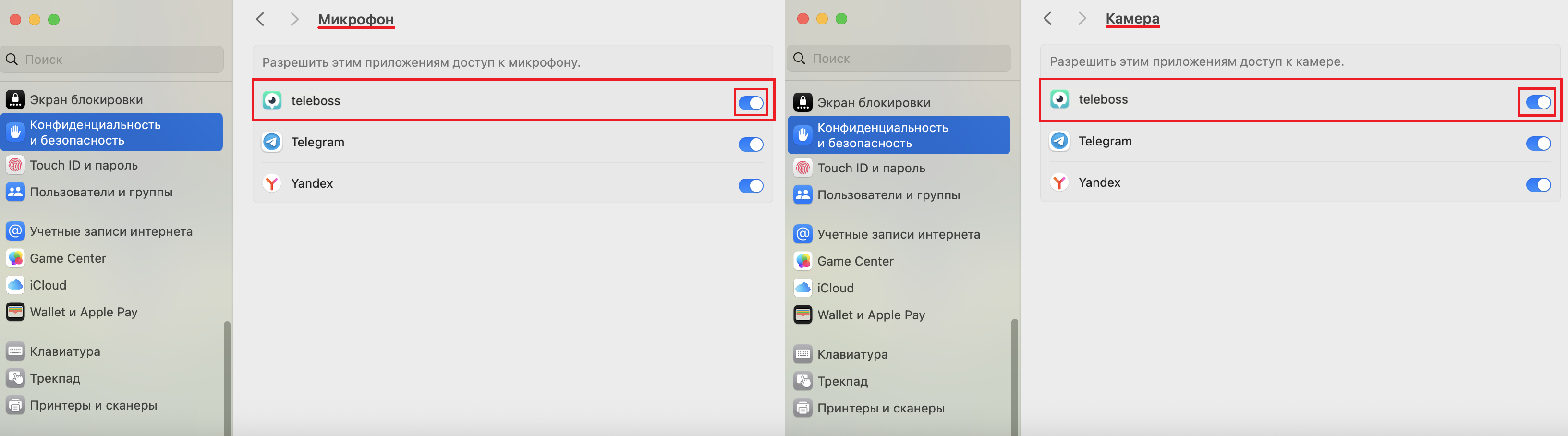 4. В боковом меню выберите нужный пункт: «Камера» или «Микрофон», а затем разрешите доступ ко всем приложениям, которые вы используете для работы на нашей платформе.