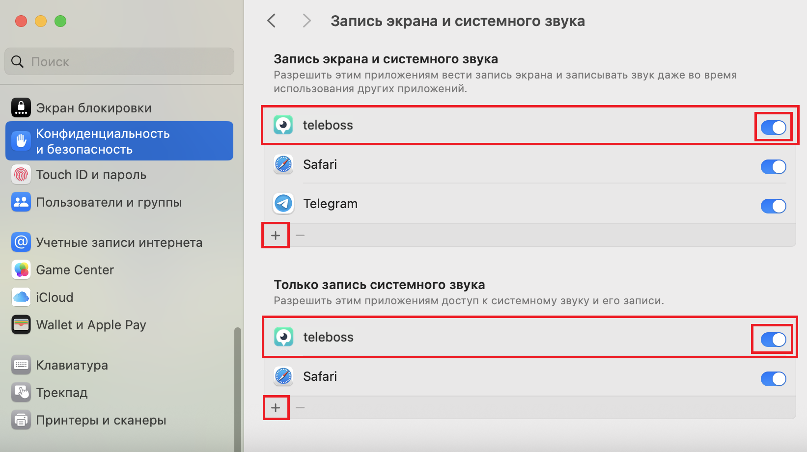 4. Добавьте TeleBoss в исключения, нажав на «+».