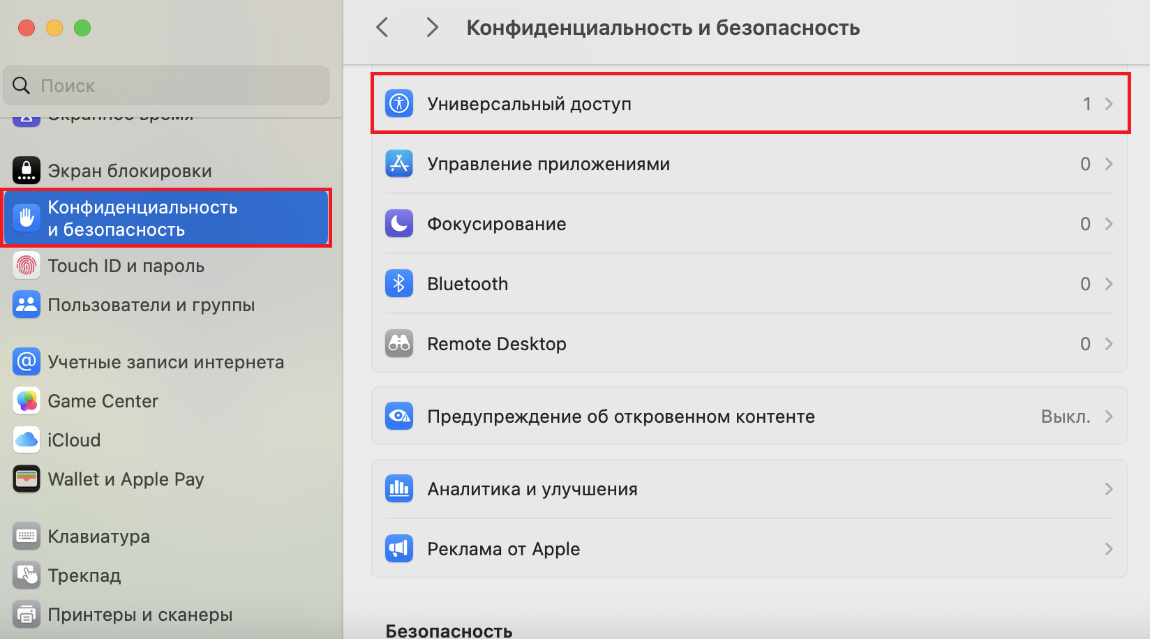 3. Выберите «Конфиденциальность и безопасность», а затем «Универсальный доступ».