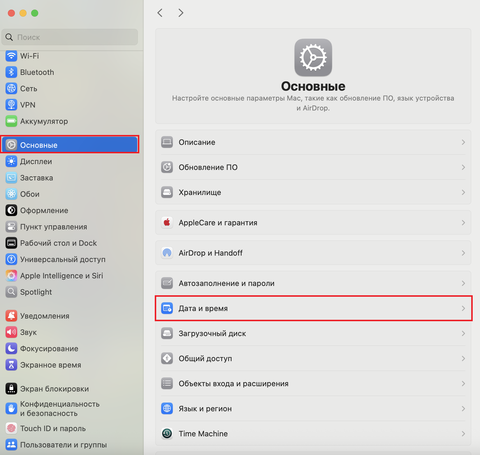 3. Нажмите «Основные» в боковом меню, затем нажмите «Дата и время» справа.