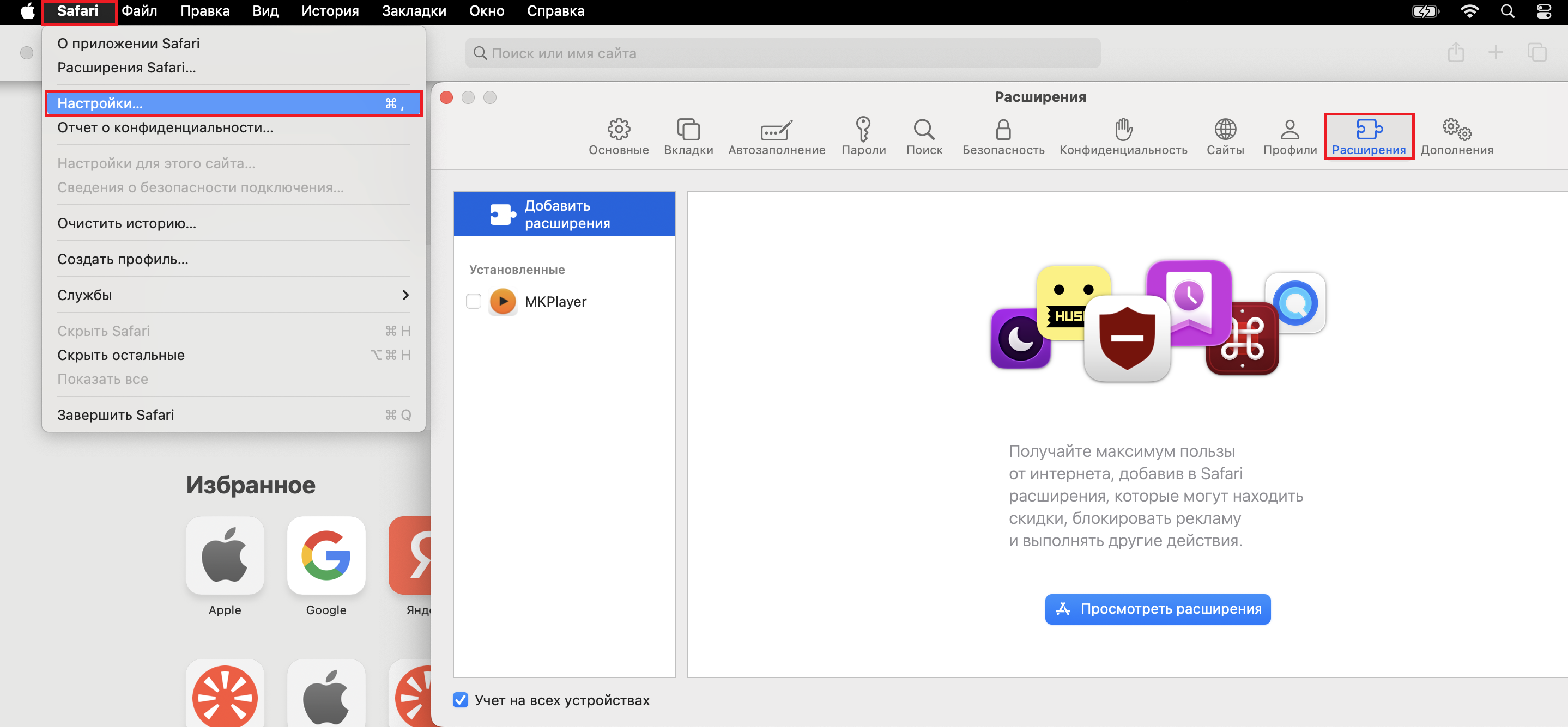 1. Вызовете меню Safari и откройте вкладку «Настройки»